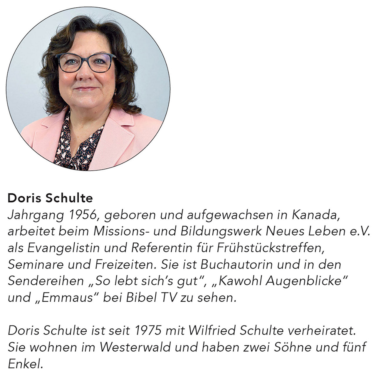 Das weiß Doris Schulte nur zu gut aus ihrem eigenen Leben. Aus ihrer kanadischen Heimat hat Gott die bekannte Evangelistin nicht nur nach Deutschland, sondern auch durch viele kleine und große Entscheidungen geführt. Sie lässt uns an so manchen Aha-Erlebnissen teilhaben, die auch uns helfen können, mutig und vertrauensvoll an Gottes Hand durchs Leben zu gehen.