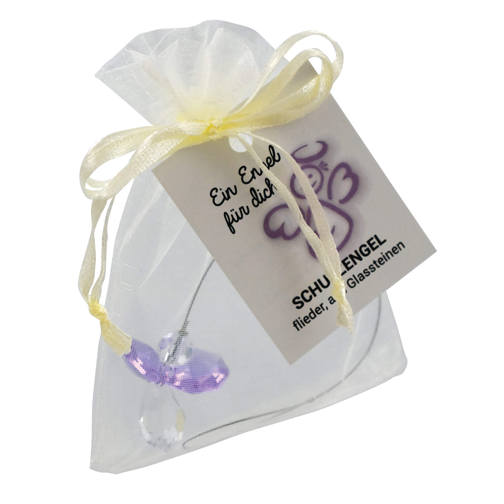 Der Anhänger mit den fein geschliffenen Glassteinen in Form eines Schutzengelchens am Metallband ist für viele Gelegenheiten eine wunderbare Aufmerksamkeit. Unterstrichen wird die liebevolle Geste noch durch ein Schmuckkärtchen, auf dem der Spruch "Ein Engel für dich" farblich passend zu den Glassteinen gestaltet wurde.