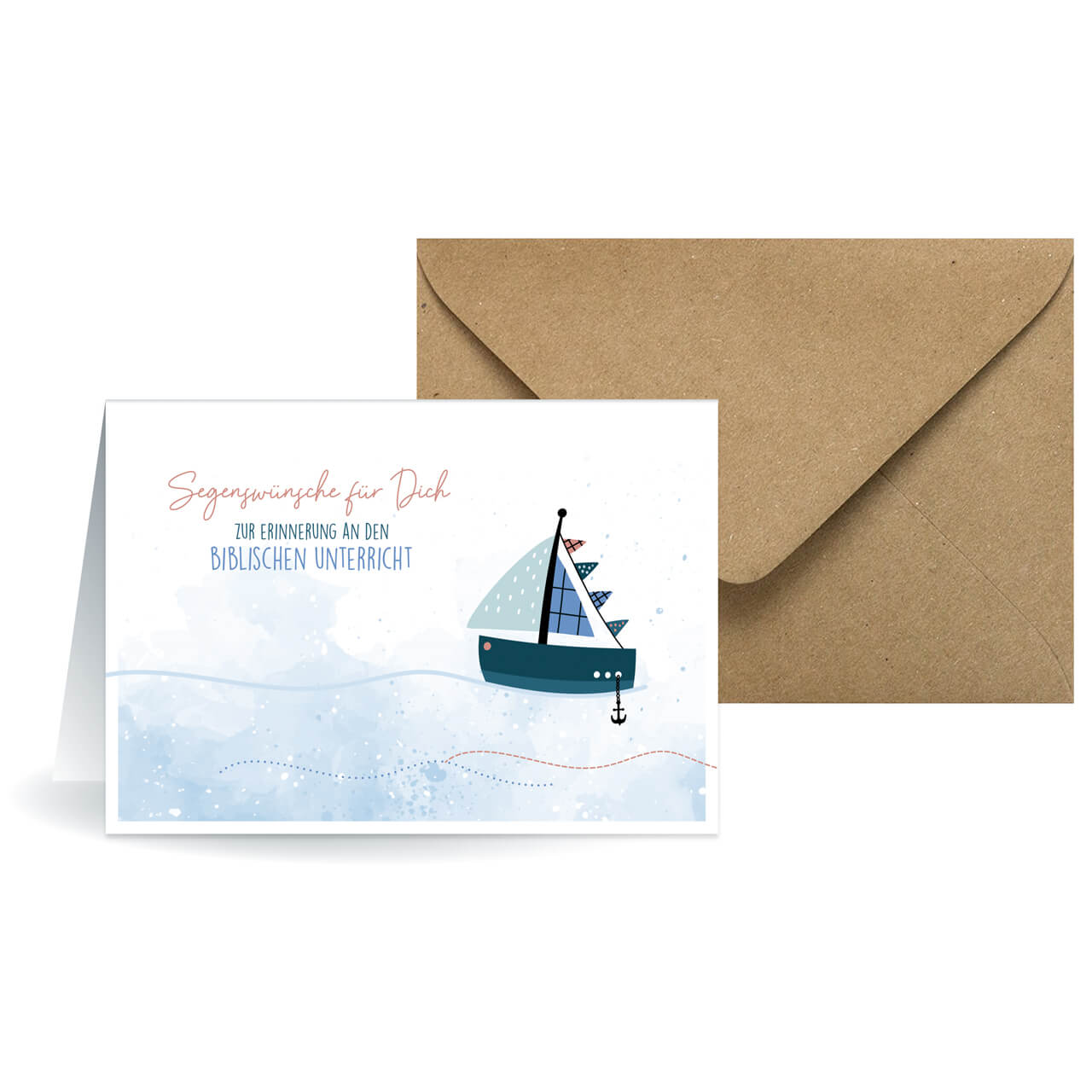 Zur Erinnerung an den Biblischen Unterricht: Faltkarte mit modernem Motiv Boot "Segenswünsche für Dich", veredelt mit beidseitig partieller UV-Lackierung.