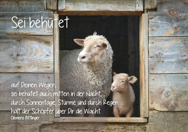 Sei behütet auf deinen Wegen, sei behütet auch mitten in der Nacht, durch Sonnentage, Stürme und durch Regen hält der Schöpfer über dir die Wacht.