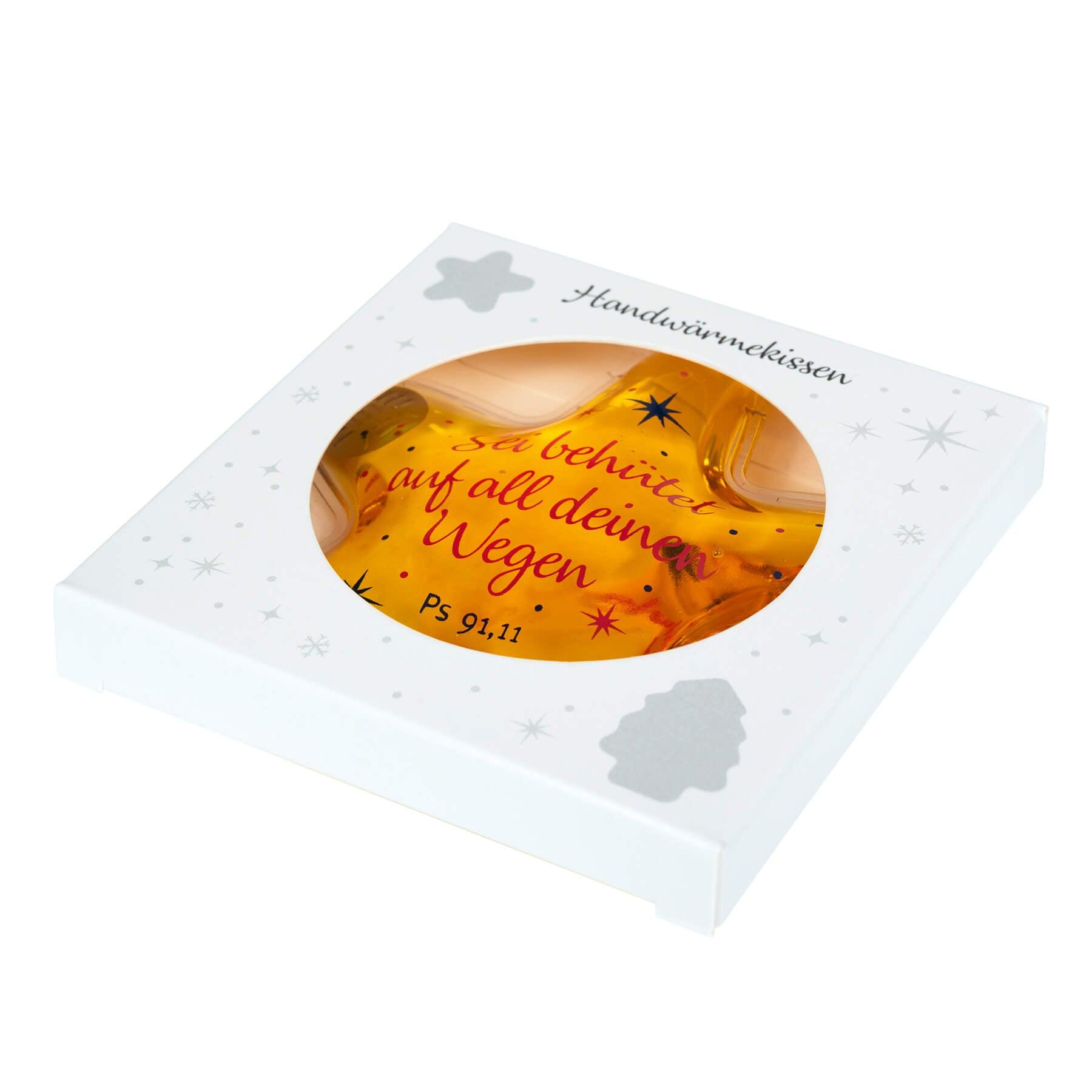 Praktisch für unterwegs, Stern bedruckt mit "Sei behütet auf all deinen Wegen Ps 91,11", liebevoll grafisch umgesetzt. Wiederverwendbar: Dazu das benutzte Wärmekissen vor dem nächsten Gebrauch einige Minuten in kochendes Wasser legen, bis sich die Salzkristalle in dem Kissen aufgelöst und verflüssigt haben.