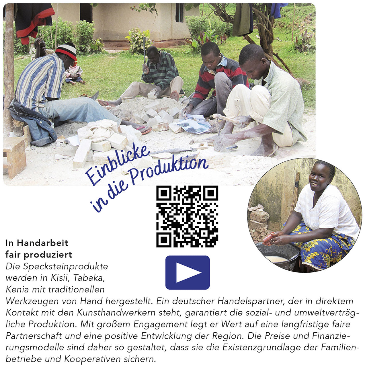 Die Specksteinprodukte werden in Kisii, Tabaka, Kenia mit traditionellen Werkzeugen von Hand hergestellt. Ein deutscher Handelspartner, der in direktem Kontakt mit den Kunsthandwerkern steht, garantiert die sozial- und umweltverträgliche Produktion.
