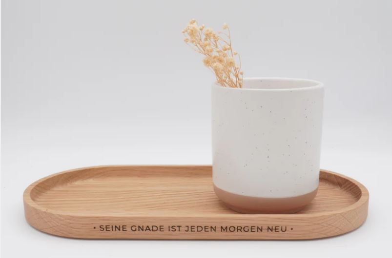 Dezent am Rand eingraviert, erinnert der Schriftzug "Seine Gnade ist jeden Morgen neu" an Gottes tägliche Treue und Erneuerung - eine Einladung, jeden Tag mit Zuversicht und Dankbarkeit zu beginnen.