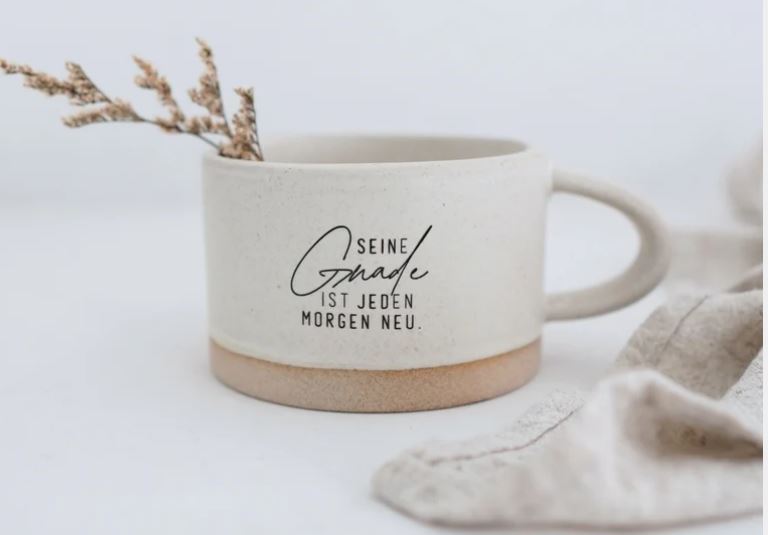 Diese vollständig handgefertigte Steingut-Tasse "RUSTY-S" mit ihrer reaktiven Sesamglasur und der Gravur "Seine Gnade ist jeden Morgen neu" ist mehr als ein Alltagsgegenstand - sie ist eine tägliche Erinnerung an die unendliche Gnade und Liebe Gottes, die uns jeden Morgen aufs Neue begegnet. Perfekt für den Start in den Tag oder eine ruhige Auszeit mit einem heißen Getränk.