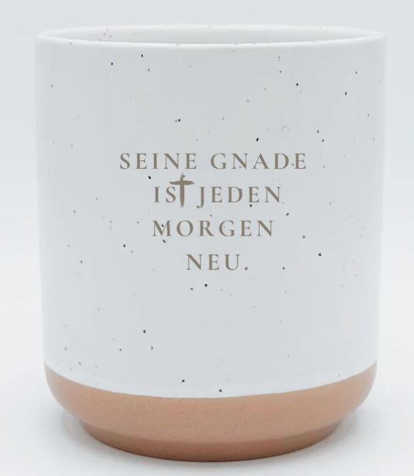 Entdecke unseren handgemachten Steingut-Becher mit der inspirierenden Gravur "Seine Gnade ist jeden Morgen neu".