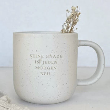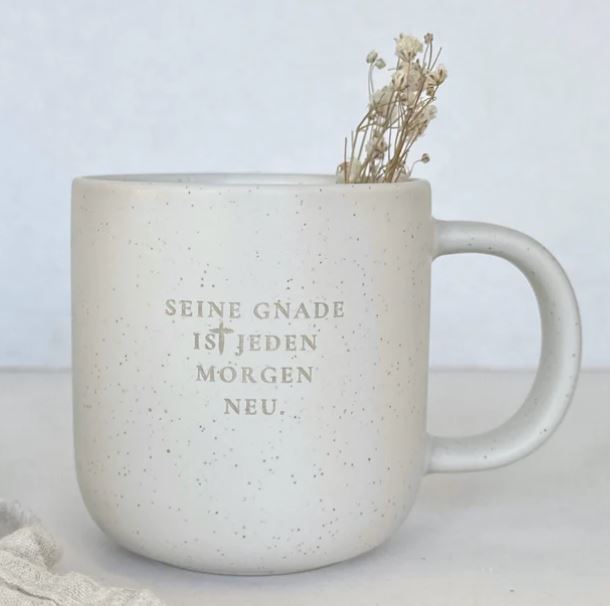 Hochwertige und elegante Steinzeugtasse für gemütliche Kaffee- oder Tee-Momente. Robust, langlebig und stilvoll - perfekt für den täglichen Gebrauch. Diese Tasse erinnert uns täglich an die unendliche Gnade und Liebe, die uns jeden Morgen aufs Neue begegnet. Perfekt für den Start in den Tag oder eine ruhige Auszeit mit einem heißen Getränk. Diese Tasse verbindet Funktionalität mit einem geistlichen Statement, das in jedem Moment Kraft und Inspiration schenkt.