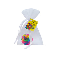 Verpackt ist der bunte Knoten-Ball in einem Organzabeutel, versehen mit einem Schmuckkärtchen. Darauf ist die beliebte Aussage: "Smile: Jesus loves you!" gedruckt.