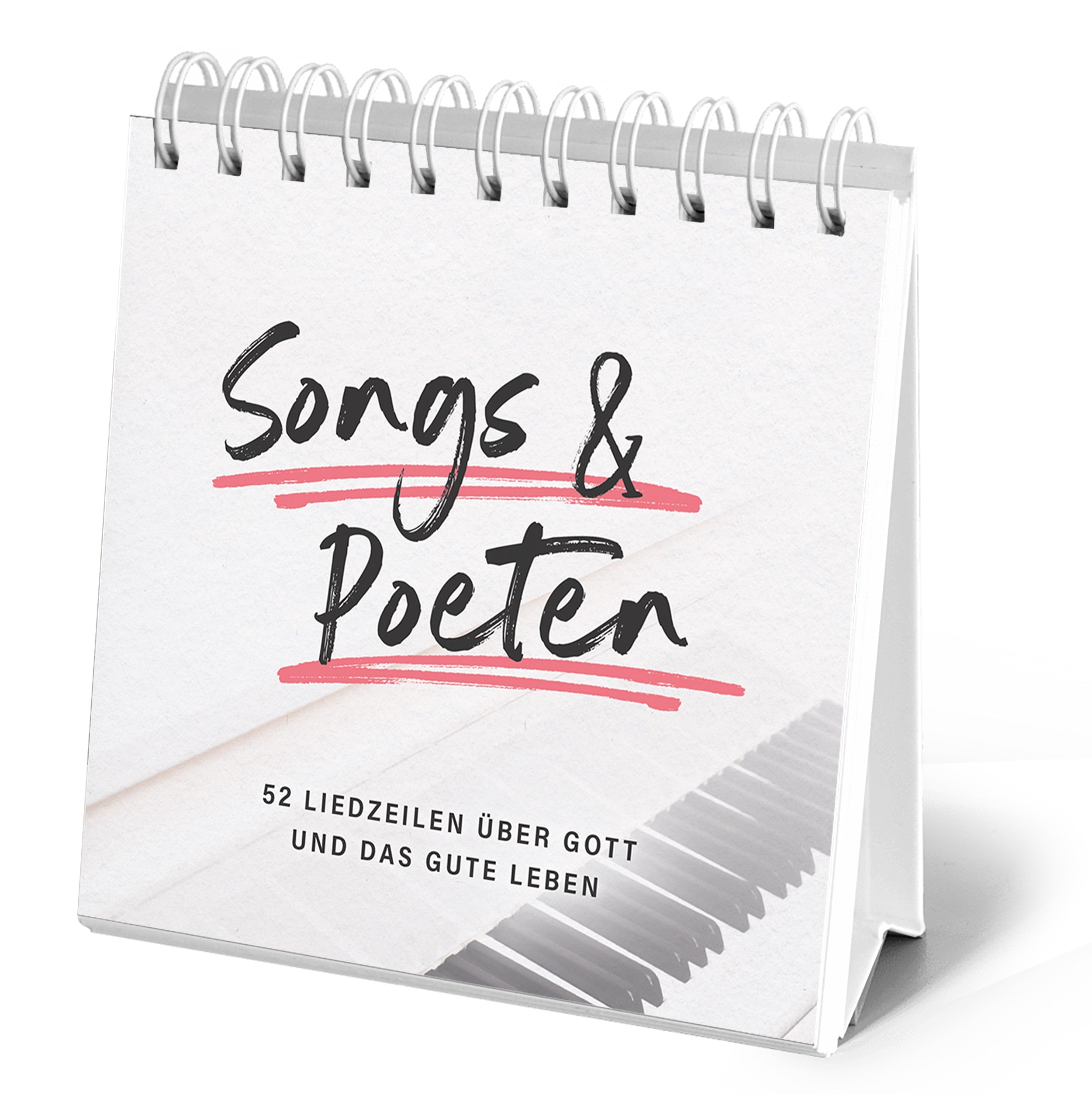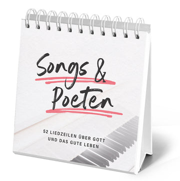 Das Aufstellbuch "Songs und Poeten" bündelt 52 deutschsprachige Liedzitate - von Newcomern der deutschen Musikbranche, bekannten Singer-Songwritern, Lobpreisbands und zeitlosen Klassikern der Musiktradition.