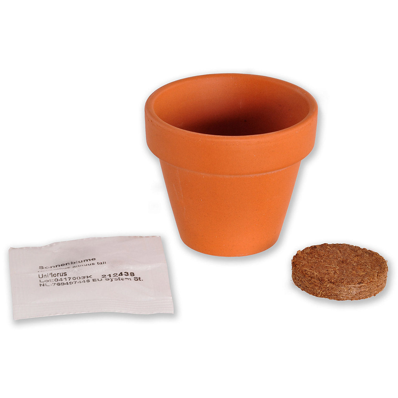 - kleiner Blumentopf mit einer Substrat-Tablette und Saatgut: Mohnblumen