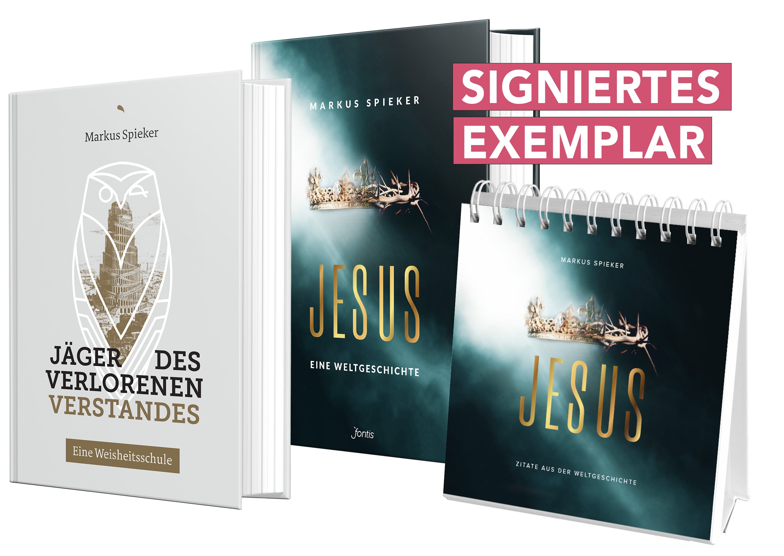 Bestseller-Autor Markus Spieker weiß, wie man gefragtes Wissen unterhaltsam vermittelt, und tut dies in seinen Büchern auf unvergleichliche Art. Das Aktionspaket "Spieker-Special" enthält 1 Exemplar der brandneuen Weisheitskunde "Jäger des verlorenen Verstandes", 1 vom Autor handsigniertes Exemplar des Bestsellers "Jesus. Eine Weltgeschichte" sowie 1 attraktives Aufstellbuch "Jesus. Zitate aus der Weltgeschichte" zum Vorzugspreis.