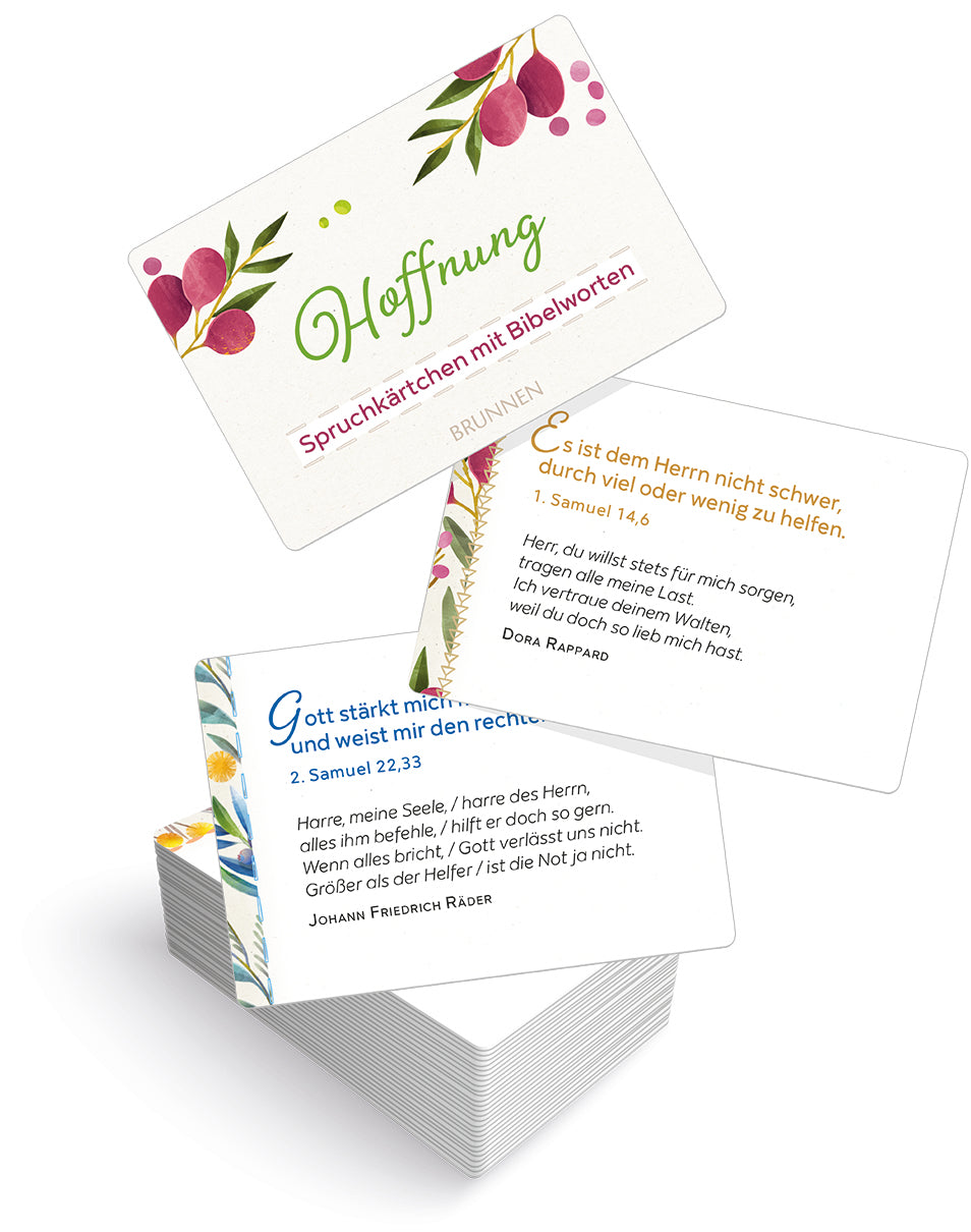 Für die Gäste am Silvesterabend bei einer Freizeit oder Geburtstagsfeier. Oder als kleine Aufmerksamkeit zwischendurch für Freunde Nachbarn oder Bekannte sind diese Spruchkärtchen bestens geeignet: Jede enthält eine Verheißung aus der Bibel und einen Liedvers aus der großen Tradition geistlicher Lieder. Das macht vielen Menschen Freude.