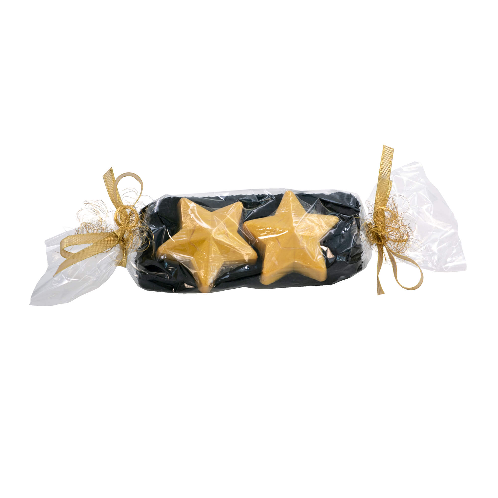 Das duftende Geschenk-Set "Stern" enthält einen schwarzen Waschhandschuh aus 100 % Baumwolle und zwei goldfarbene Stern-Seifen mit Vanilleduft (je 35 g).