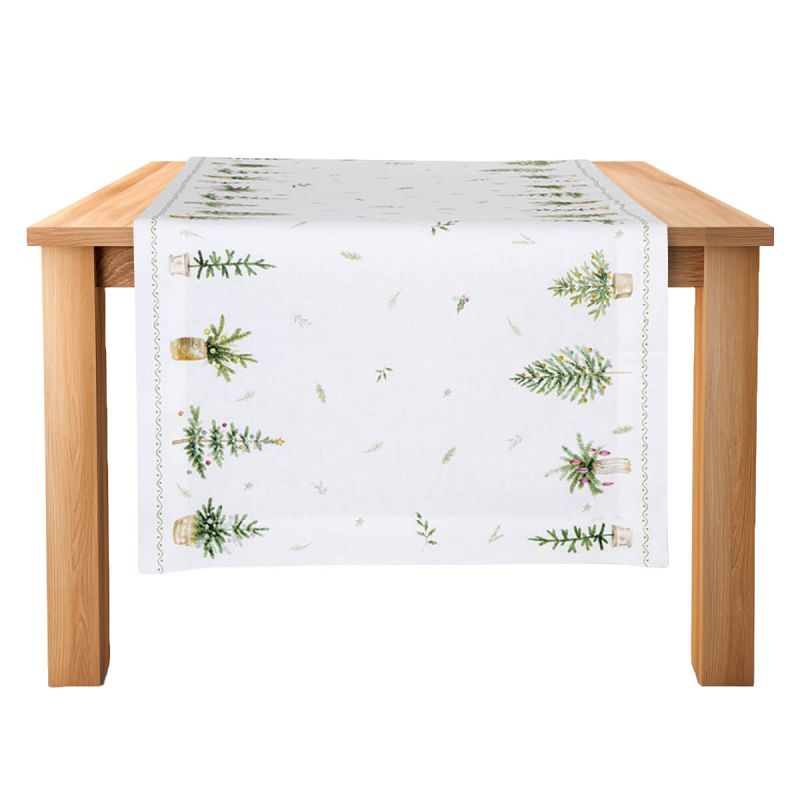 In der Advents- und Weihnachtszeit wird im Haus besonders gern dekoriert. Mit verschiedenen Tannenbäumen und Zweigen liebevoll illustriert, bildet dieser Tischläufer eine schöne Basis auf Tisch oder Sideboard.