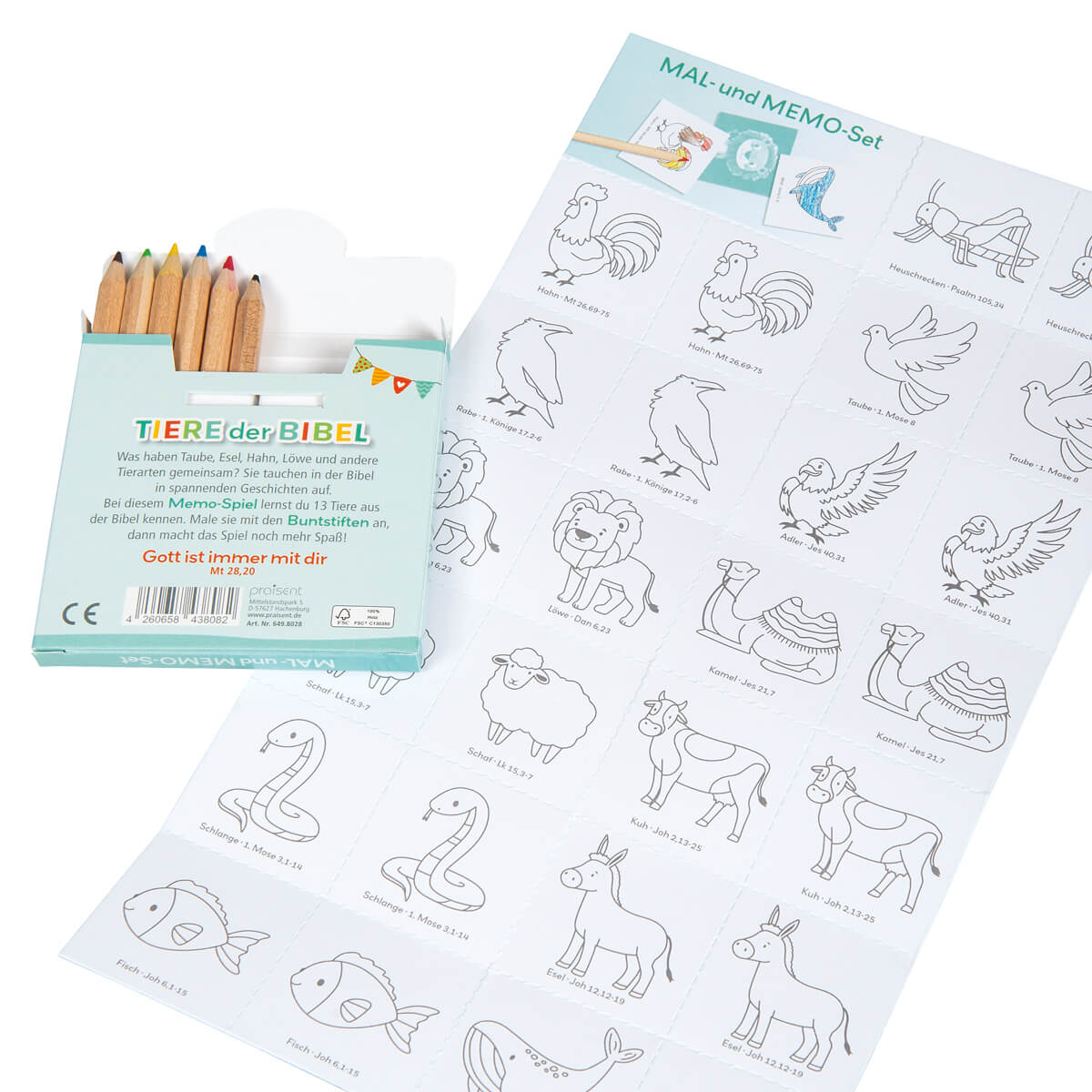 Was haben Taube, Esel, Hahn, Löwe und andere Tierarten gemeinsam? Sie tauchen in der Bibel in spannenden Geschichten auf. Bei diesem Memo-Spiel "Tiere der Bibel" lernen Kinder 13 Tiere aus der Bibel kennen.