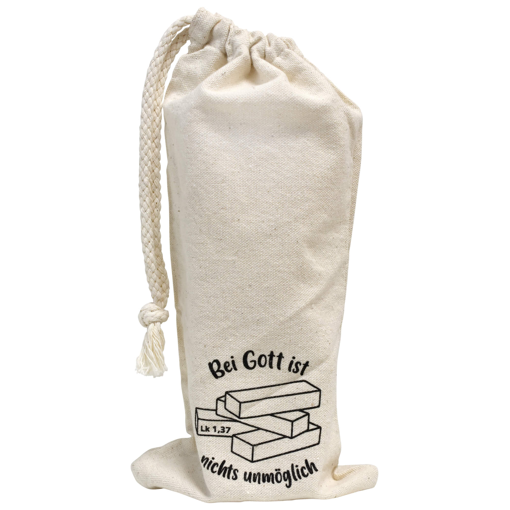 Der praktische Aufbewahrungsbeutel aus Baumwolle ist bedruckt mit "Bei Gott ist nichts unmöglich - Lk 1,37".