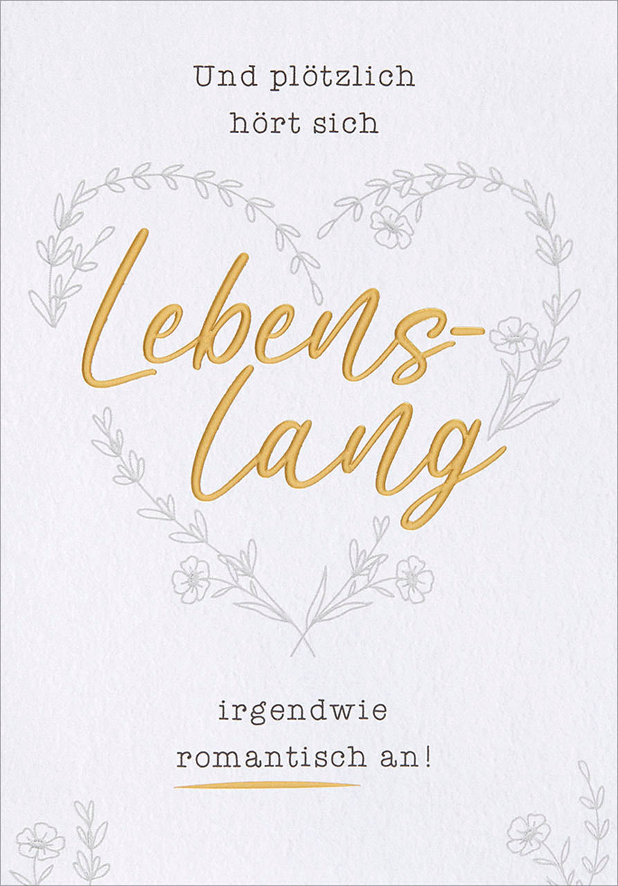 Der Schriftzug "Und plötzlich hört sich lebenslang irgendwie romantisch an!" ist in goldveredelter Typografie gestaltet und verleiht der Karte einen besonderen Glanz.