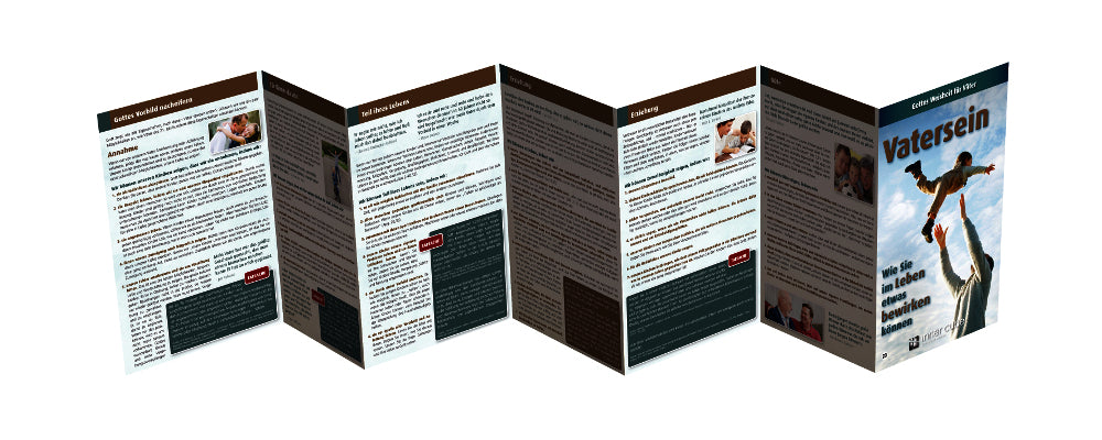 Entgegen der Botschaft, die so mancher Kinfofilm transportiert und so manche Fernsehsendung verkündet, sind Väter außerordentlich wichtig für ihre Kinder und für deren Entwicklung. Diese Studienfaltkarte ist ein inspirierender und ermutigender Appell an alle Männer, sich mit dem Thema Vaterschaft intensiv zu beschäftigen und sich dabei mehr und mehr zu wahren Vätern zu entwickeln. Gestützt auf die Aussagen der Bibel, belegt durch einschlägige Statistiken und