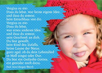 Vergiss es nie: Dass du lebst, war keine eigene Idee, und dass du atmest, kein Entschluss von dir. Vergiss es nie: Dass du lebst, war eines anderen Idee, und dass du atmest, sein Geschenk an dich. Du bist gewollt, kein Kind des Zufalls, keine Laune der Natur, ganz egal, ob du dein Lebenslied in Moll singst oder Dur. Du bist ein Gedanke Gottes, ein genialer noch dazu.
