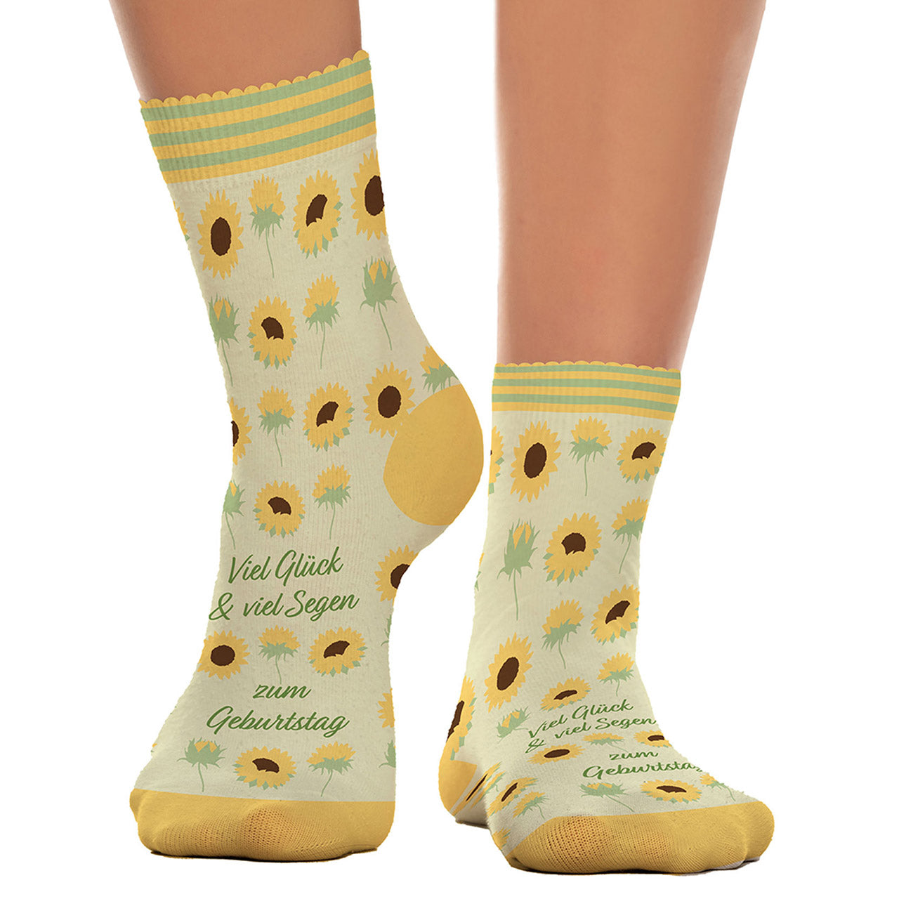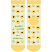 Gemütliche, farbenfrohe Socken mit Geburtstagswunsch und schönem Sonnenblumen-Motiv.