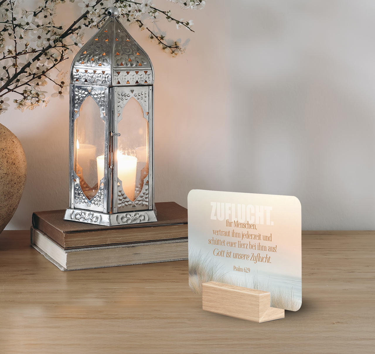 Die Boxen eignen sich als ermutigendes Geschenk oder einfach als kleine Aufmerksamkeit. Der Holzaufsteller aus edlem Material stellt sicher, dass der ausgewählte Bibelvers selbst auf dem kleinsten Tisch schön zur Geltung kommt. Die 30 Karten mit abgerundeten Ecken liegen angenehm in der Hand.