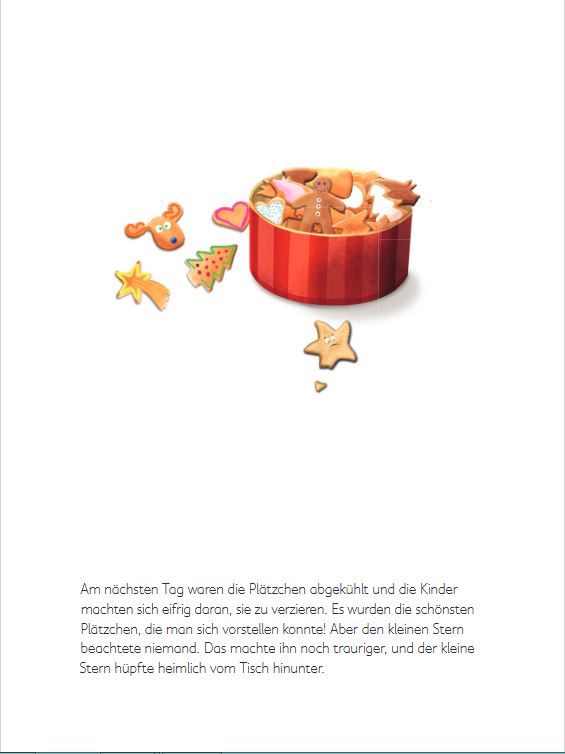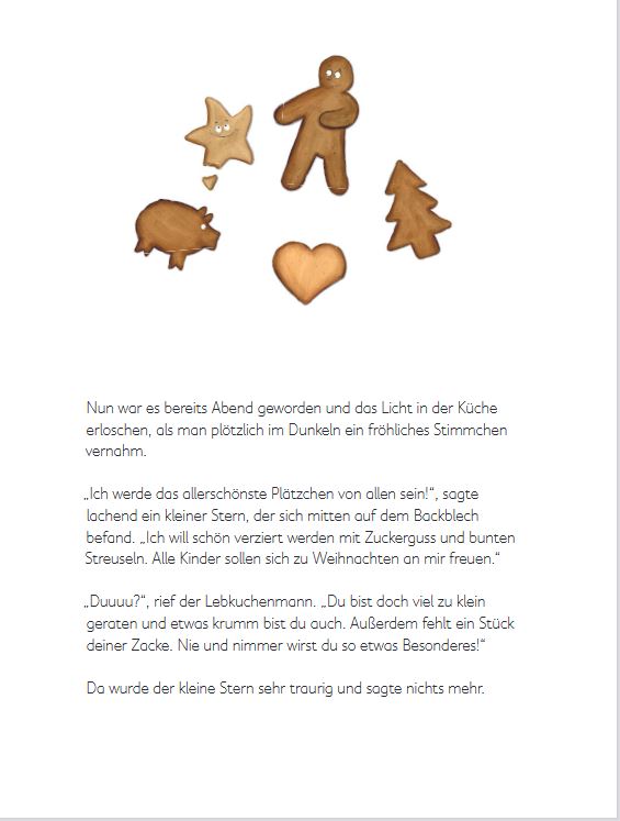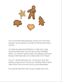 Etwas zu klein und krumm ist der kleine Stern geraten, außerdem fehlt ihm ein Stück seiner Zacke ... Dabei wollte er doch das allerschönste Weihnachtsplätzchen werden! Ganz mutlos verschwindet er nach draußen in den Schnee. Dort begegnet er einigen Tieren und erfährt, dass es etwas Wichtigeres gibt, als gut auszusehen ...