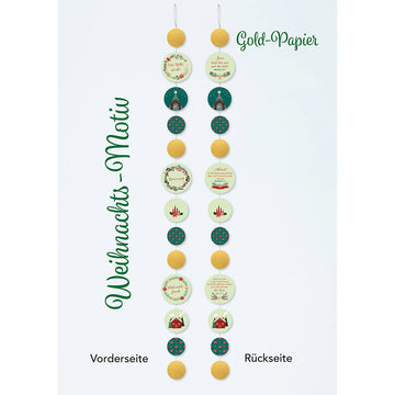 13 Kreise, Gold-Papier, genäht, ca. 100 cm lang, wird gefaltet in einem gestalteten Umschlag aus Tranzparenzpapier geliefert.
