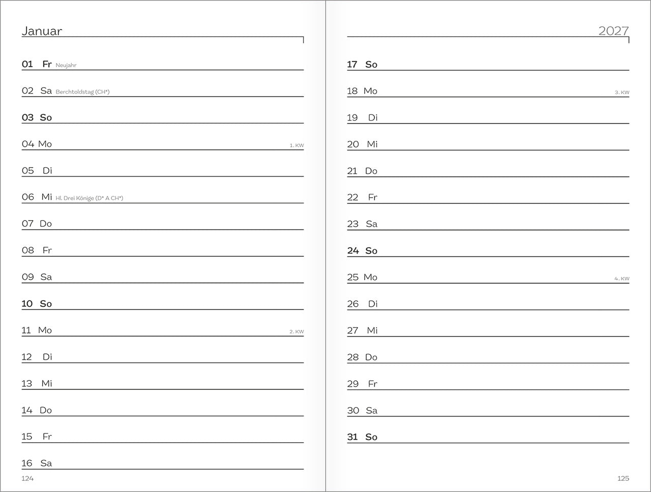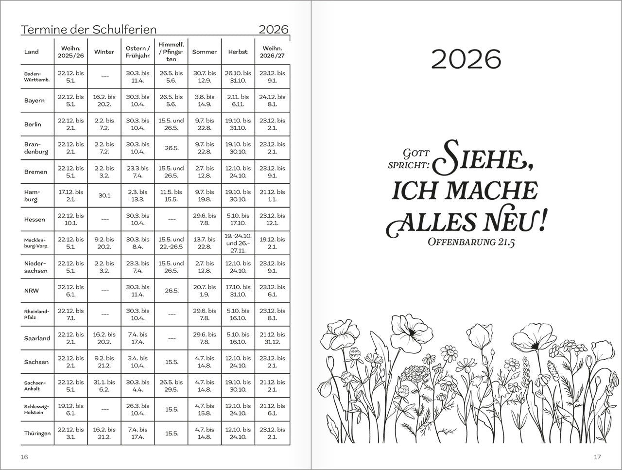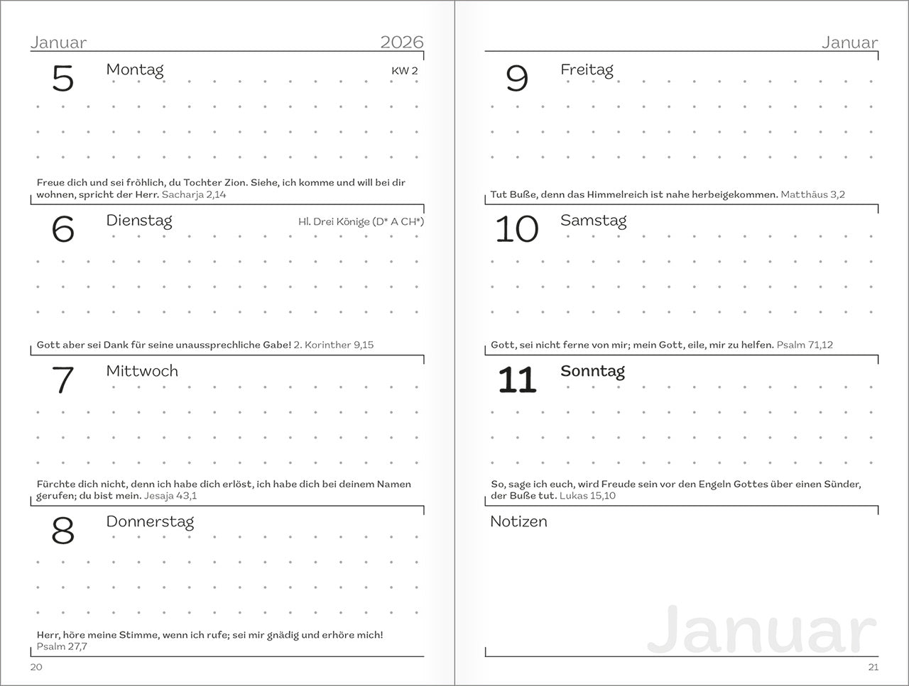 Mit ausgelosten Bibelversen für jeden Tag und viel Platz für Eintragungen.