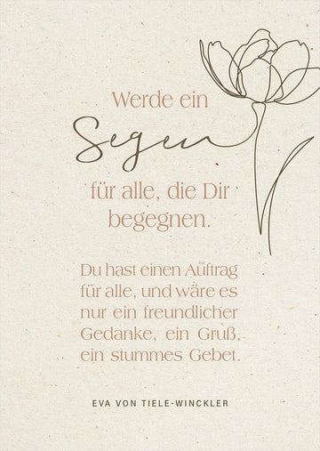 Die stilisierte oneline Blume unterstreicht die Botschaft und erinnert uns daran, wie wichtig es ist, in unserem Alltag positive Spuren zu hinterlassen - sei es durch ein freundliches Wort oder ein Gebet für andere. Diese Karte eignet sich nicht nur als Geschenk für einen besonderen Menschen, sondern auch als Ermutigung, selbst zu einem Segen für andere zu werden.