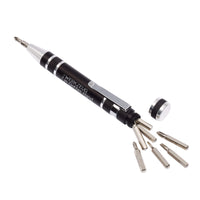 Mühelos lassen sich die im Stiftinneren enthaltenen 8 Bits (je 4 Flach- und Kreuzschlitzschraubendreher) über den abschraubbaren Deckel entnehmen und per Magnet an der Stiftspitze befestigen.