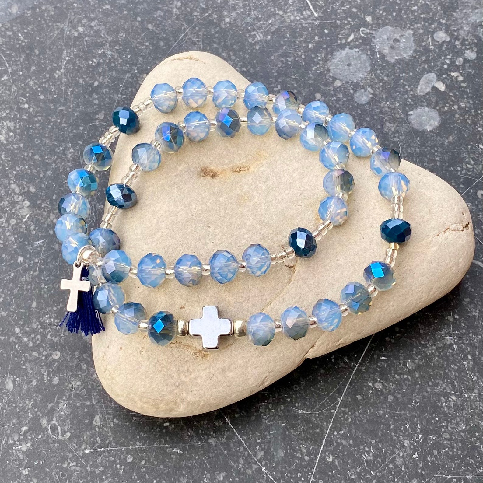 Das Wickelarmband "Elisa" sitzt mit zwei Umwicklungen sehr bequem am Handgelenk. Geschliffene Kristallperlen in blau und Glas-Rocailles werden mit einem silberfarbenen Kreuz und einer blauen Quaste abgerundet.