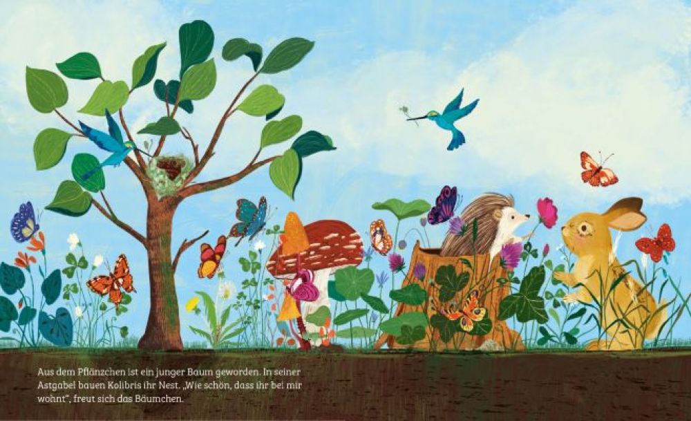 "Ich will ein großer, starker Baum werden!", denkt sich der kleine Keim und freut sich schon darauf, was er dann alles tun kann. Doch bis es soweit ist, begegnet er vielen verschiedenen Tieren und lernt, wie sehr er und die Tiere miteinander verbunden sind. Mit jedem Schritt, den das Pflänzchen auf seinem Weg zu einem großen Baum tut, lernt es zu lieben, abzugeben, treu zu bleiben und nie die Hoffnung aufzugeben.
