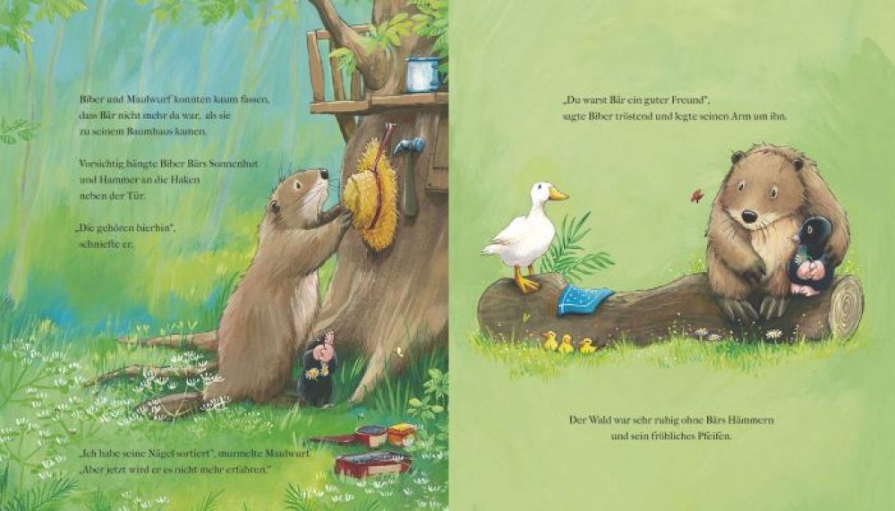 Als Bär stirbt, fällt es seinen Freunden Biber und Maulwurf schwer, zu verstehen, dass er nicht mehr da ist. Es tröstet sie, über Bär zu sprechen und sich daran zu erinnern, was sie gemeinsam erlebt haben. Aber manchmal sind sie auch einfach traurig und wütend.