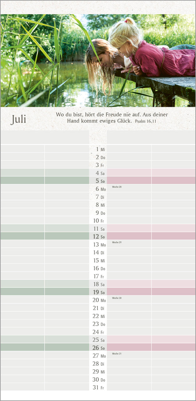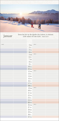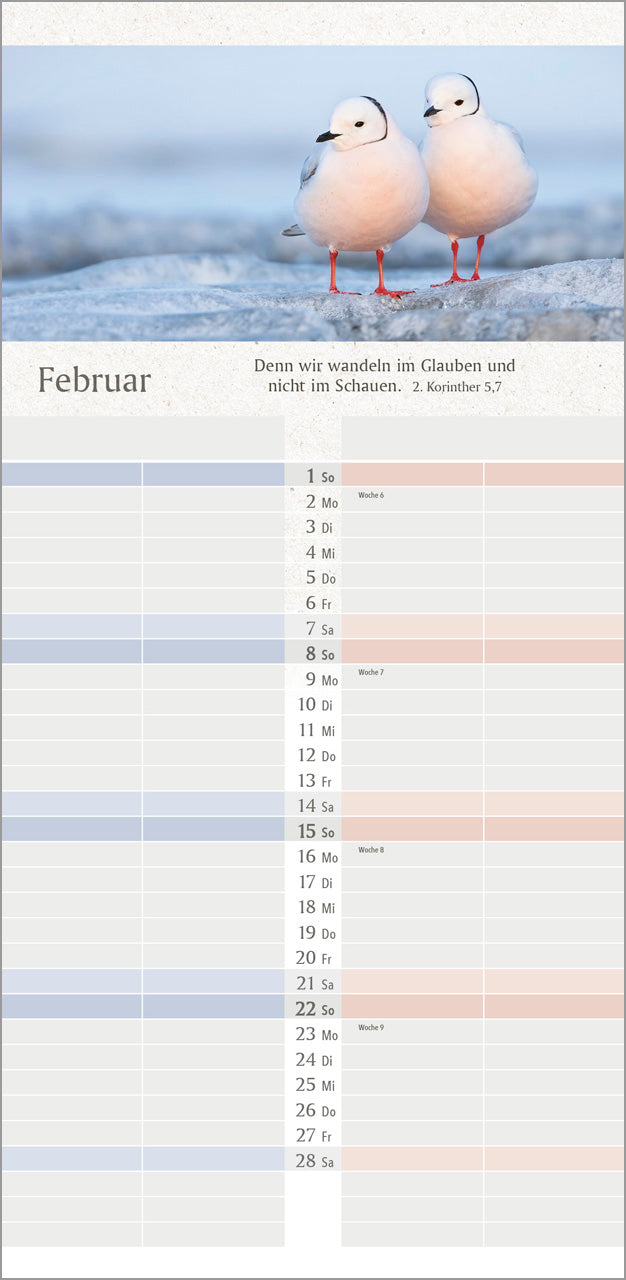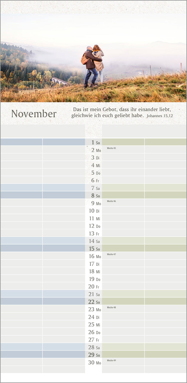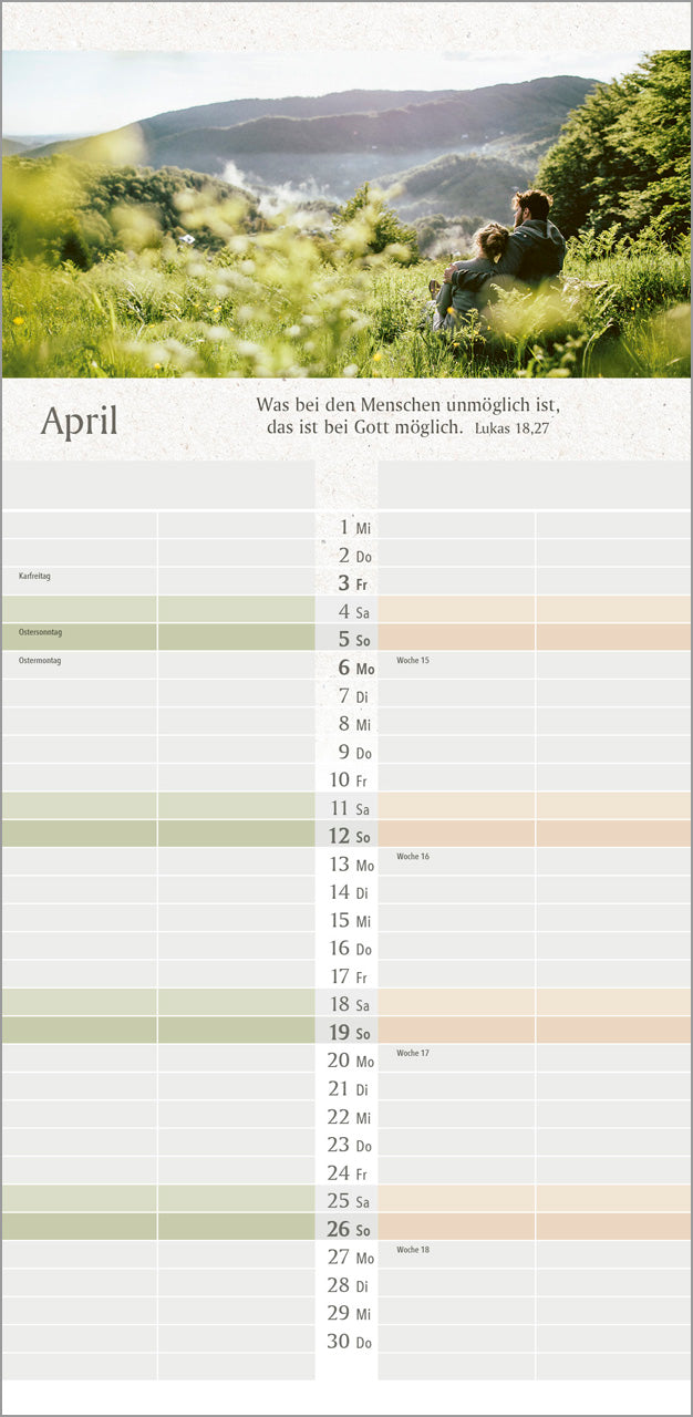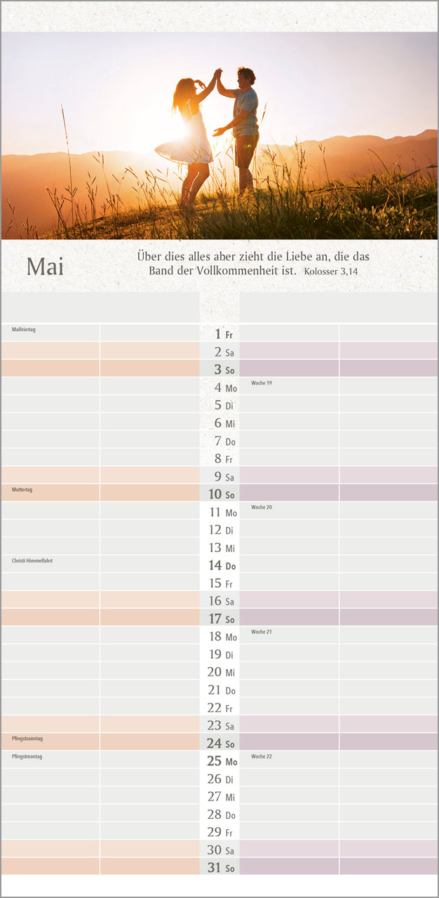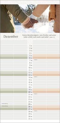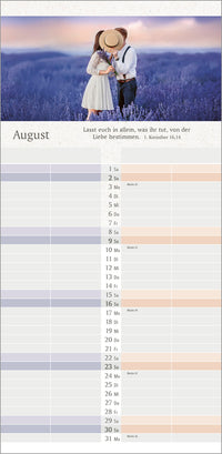 Dieser sehr übersichtliche Streifenkalender bietet viel Platz für Zwei, die ihre Termine aufeinander abstimmen wollen. Die interessante Gestaltung mit Fotos, die immer "Zwei" symbolisieren, wird junge und ältere Paare gleichermaßen ansprechen. Die Fotos werden durch aussagestarke Bibelworte ergänzt.