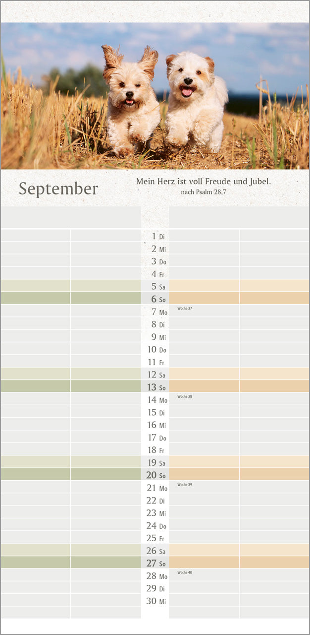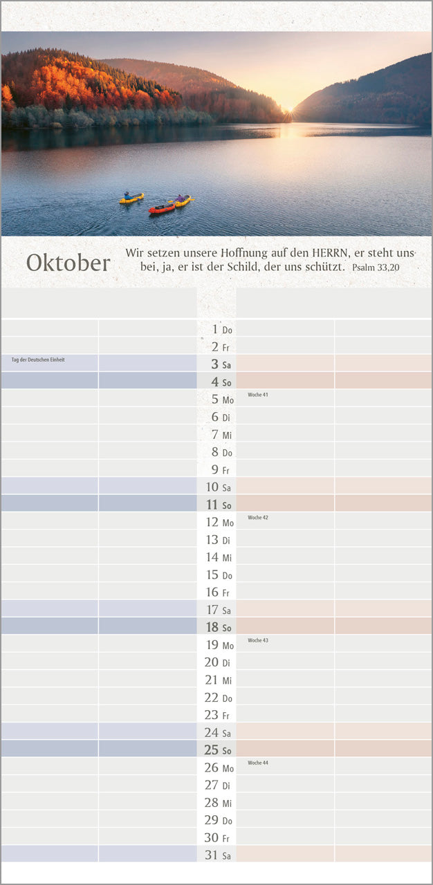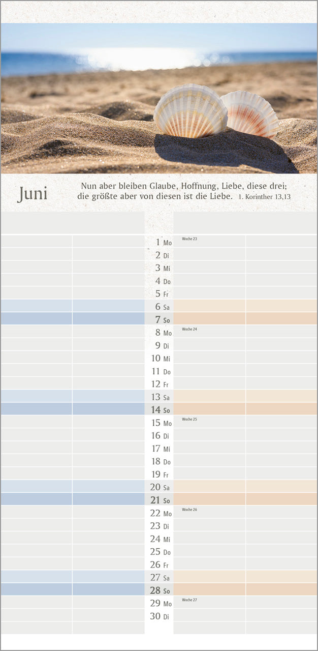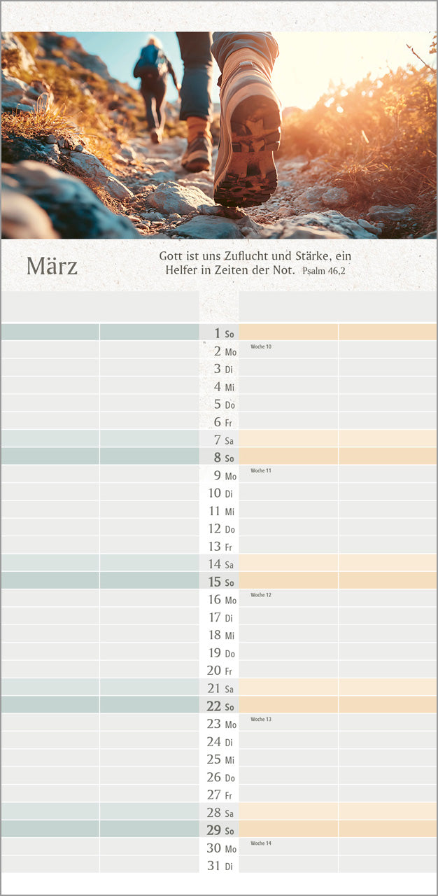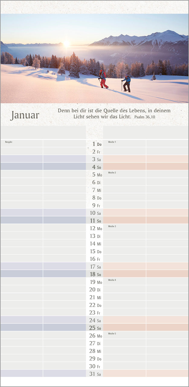 Dieser sehr übersichtliche Streifenkalender bietet viel Platz für Zwei, die ihre Termine aufeinander abstimmen wollen. Die interessante Gestaltung mit Fotos, die immer "Zwei" symbolisieren, wird junge und ältere Paare gleichermaßen ansprechen. Die Fotos werden durch aussagestarke Bibelworte ergänzt.