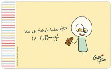 Schokolade macht glücklich, denn: "Wo es Schokolade gibt, ist Hoffnung!" Zusammen mit der liebenswerten kleinen Figur mit verschmiertem Schoko-Mund, wird dieses Brettchen zum ultimativen Geschenk für alle "Schokoholics".