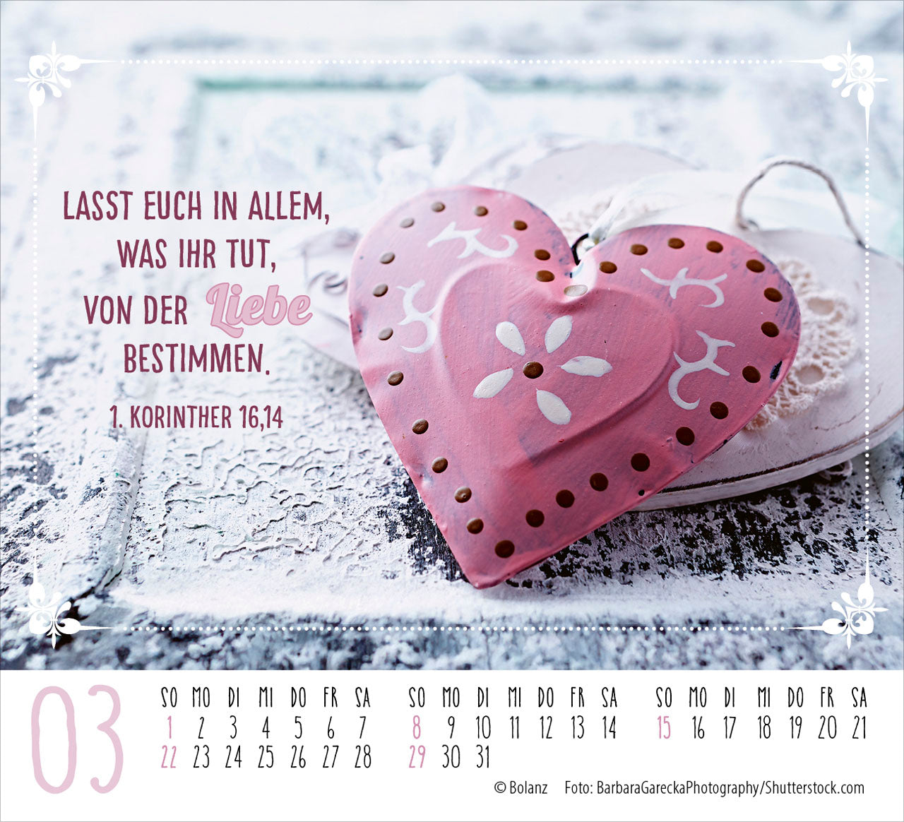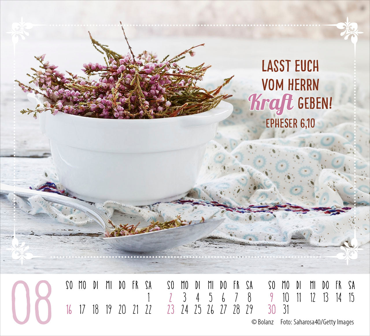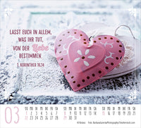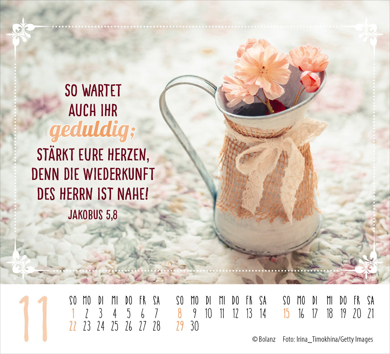 Wie gut tut es uns doch, wenn wir ein liebevolles Wort von anderen Menschen erhalten. Mit unserem Minikalender mit charmanten Fotografien im Vintagestil und wertschätzenden Bibelworten und Zitaten werden wir immer wieder daran erinnert, wie wichtig das ist. Klein, praktisch und schön. Ein ideales Geschenk oder Mitbringsel.