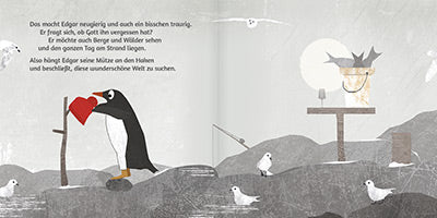 Wunderschön ist meine Welt - Wo ist die Welt am schönsten? Der Pinguin Edgar wohnt am Südpol. Eigentlich ist er ganz zufrieden. Seine Freunde, die Schneesturmvögel besuchen ihn oft und erzählen die tollsten Geschichten: von Bergen und Stränden, von Blumenwiesen und tiefen Wäldern. Sie loben Gott für die wunderschöne Welt, die er geschaffen hat. Das macht Edgar unzufrieden. Er möchte auch Berge und Wälder sehen und den ganzen Tag am Strand liegen. Er beschließt, diese wunderschöne Welt zu suchen und begibt sich auf eine abenteuerliche Reise.