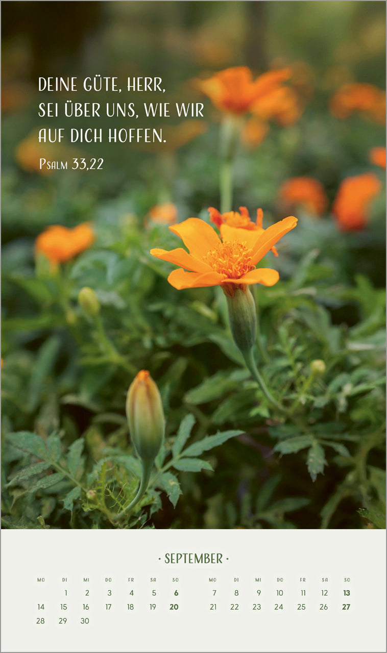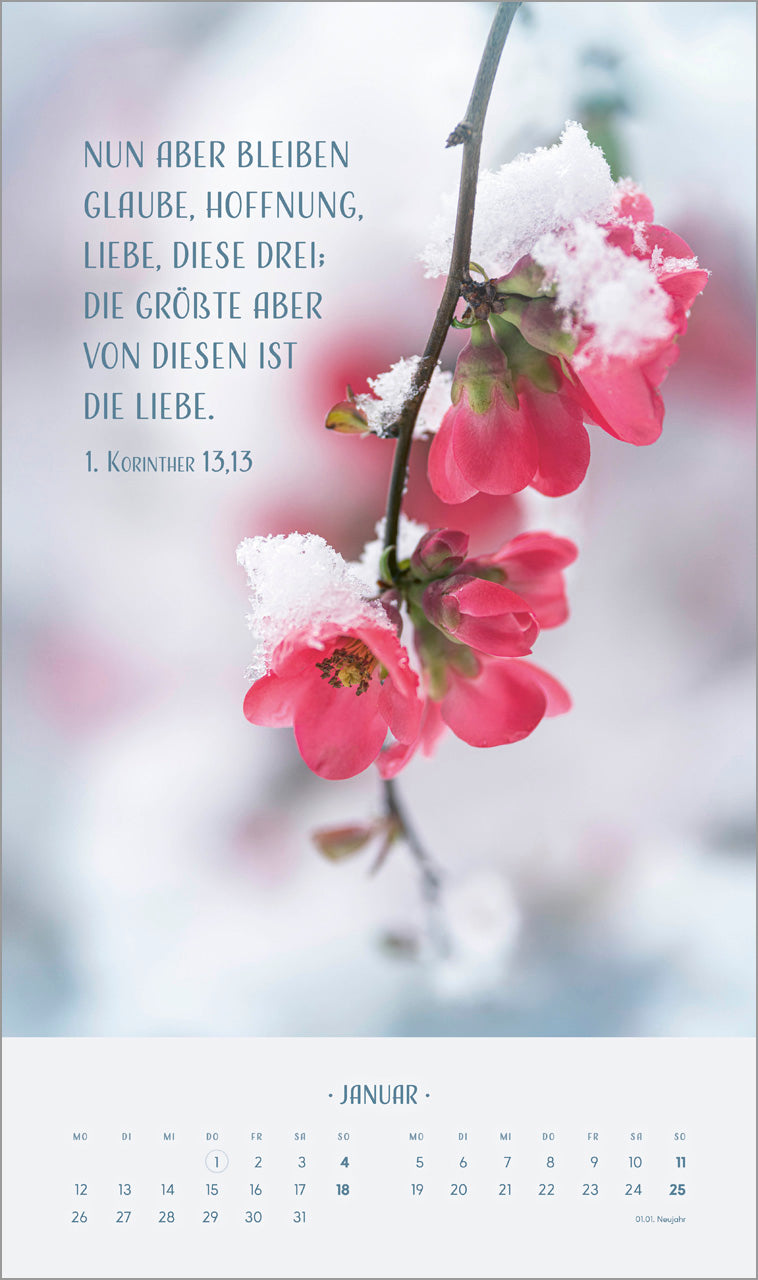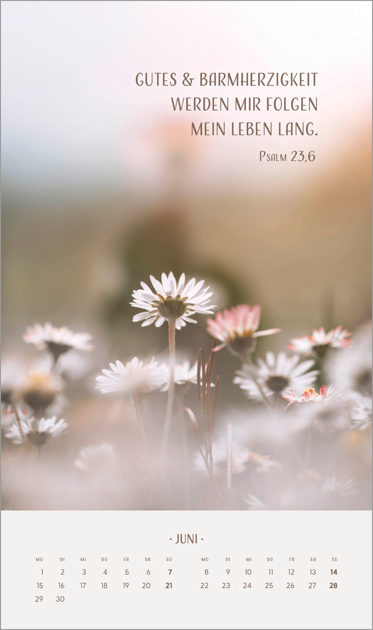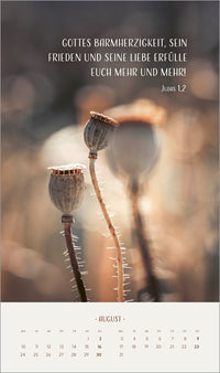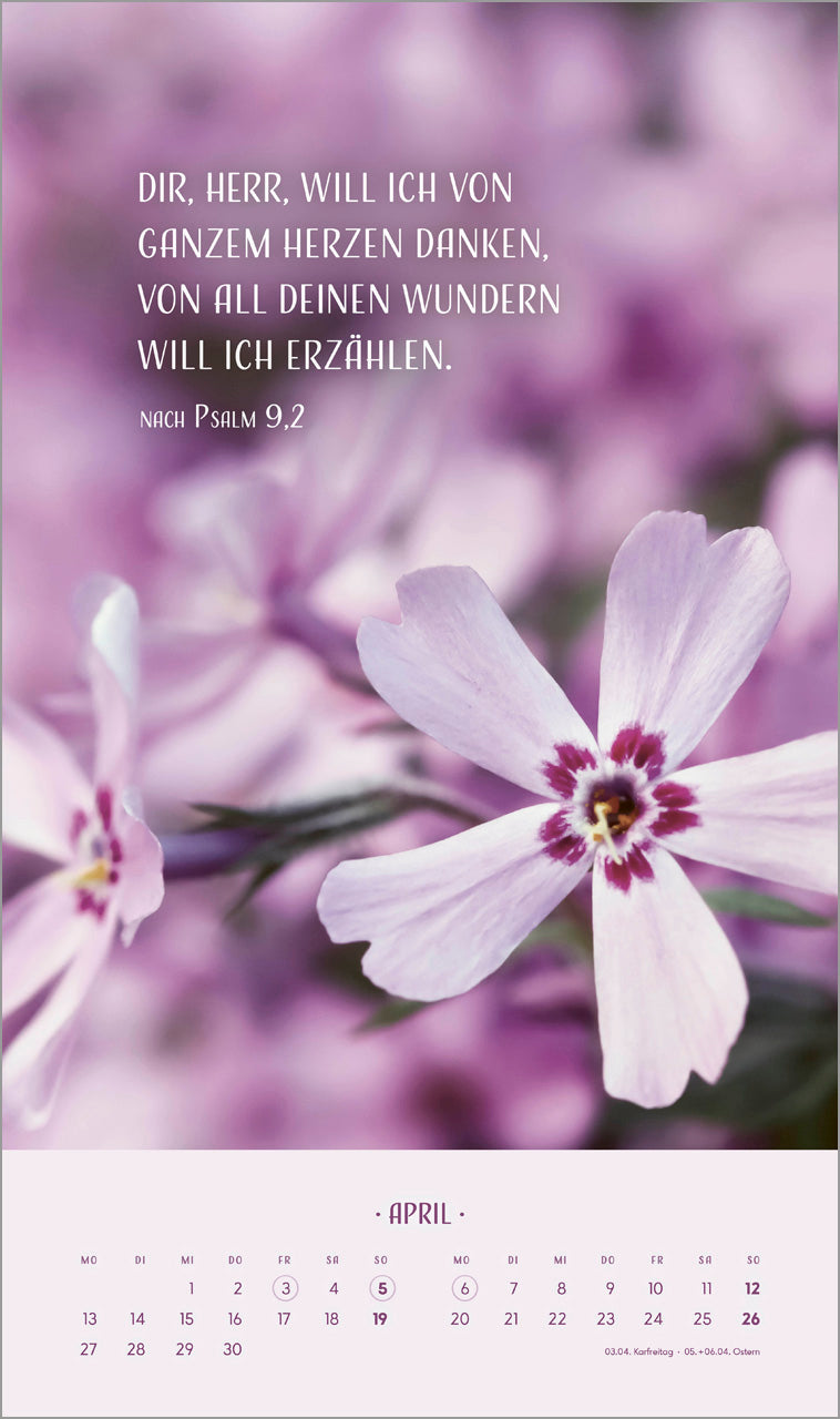 Blumenmotive in sanften Tönen prägen diesen Kalender. Auf kunstvolle Art ergänzen sich Bild und Text zu einer harmonischen Einheit.