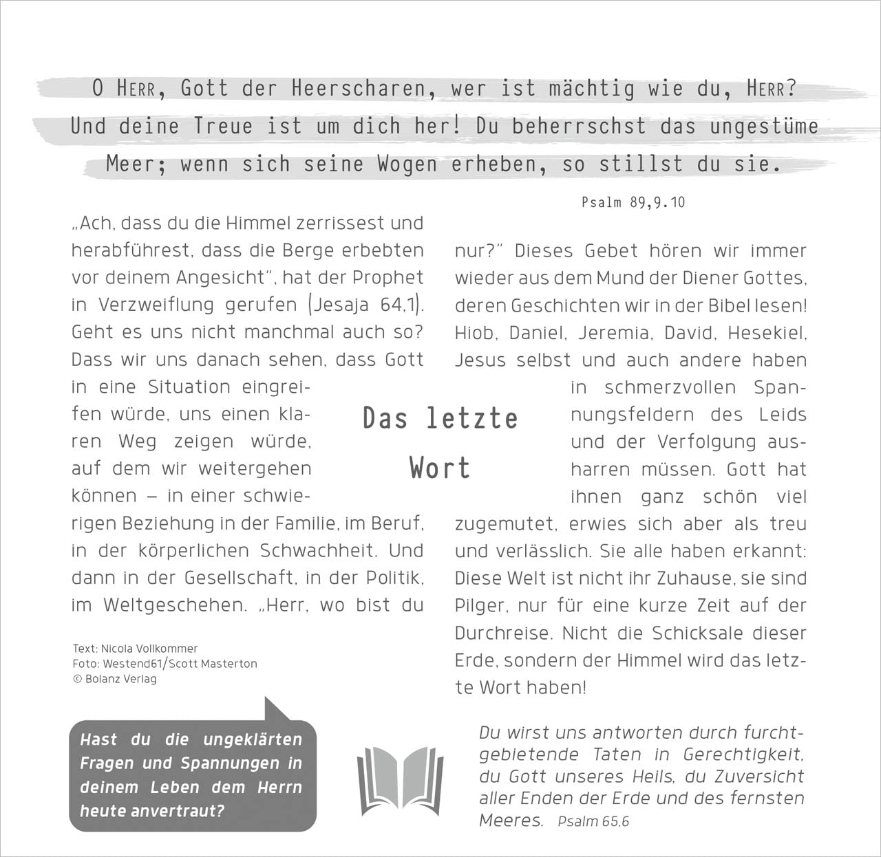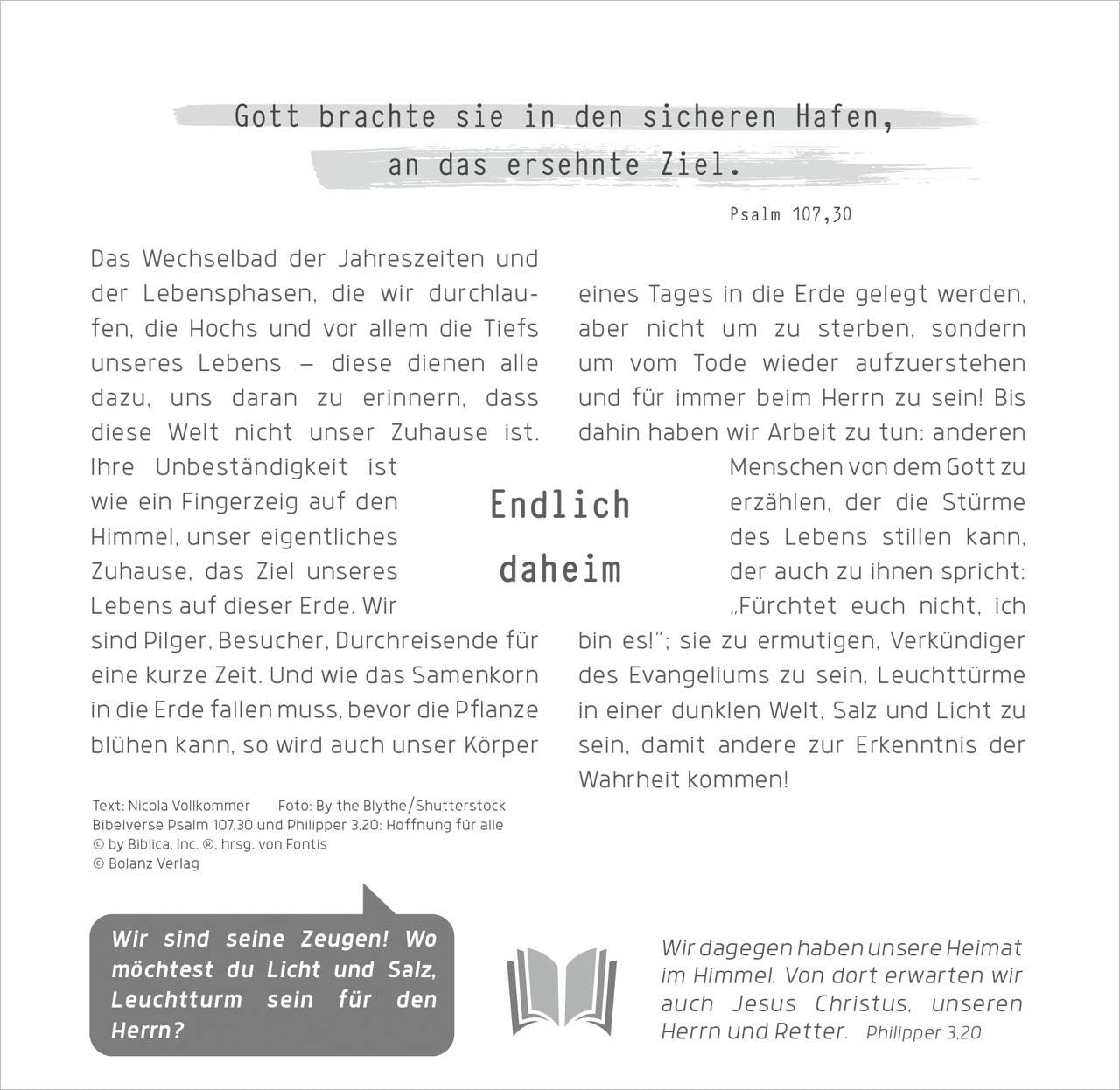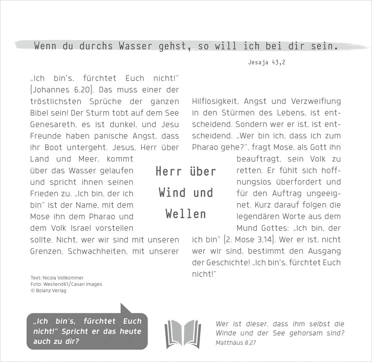 Die maritimen Motive dieses Kalenders entführen direkt in die faszinierende Welt von Meer und Strand. Sehnsuchtsbilder wecken die Lust auf das Meer und holen die raue Schönheit und den besonderen Charakter der Küste nach Hause. Die anregenden Texte von Nicola Vollkommer sind dazu eine inspirende Quelle des Glaubens.