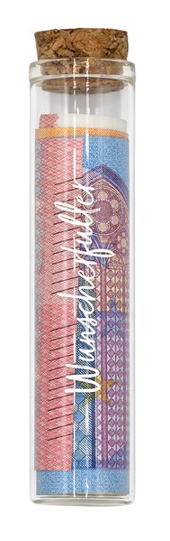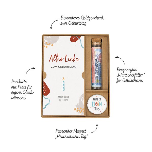 Geldgeschenke können mehr sein als nur ein einfacher Umschlag. Unser Geldgeschenk-Set bietet eine originelle und stilvolle Alternative. Das Reagenzglas mit dem Schriftzug "Wunscherfüller" gibt den Geldscheinen einen besonderen Platz in der dekorativen Geschenkbox. Persönliche Glückwünsche lassen sich auf der Postkarte "Alles Liebe zum Geburtstag" festhalten. Abgerundet wird das Set durch den ermutigenden Magneten "Heute ist dein Tag".